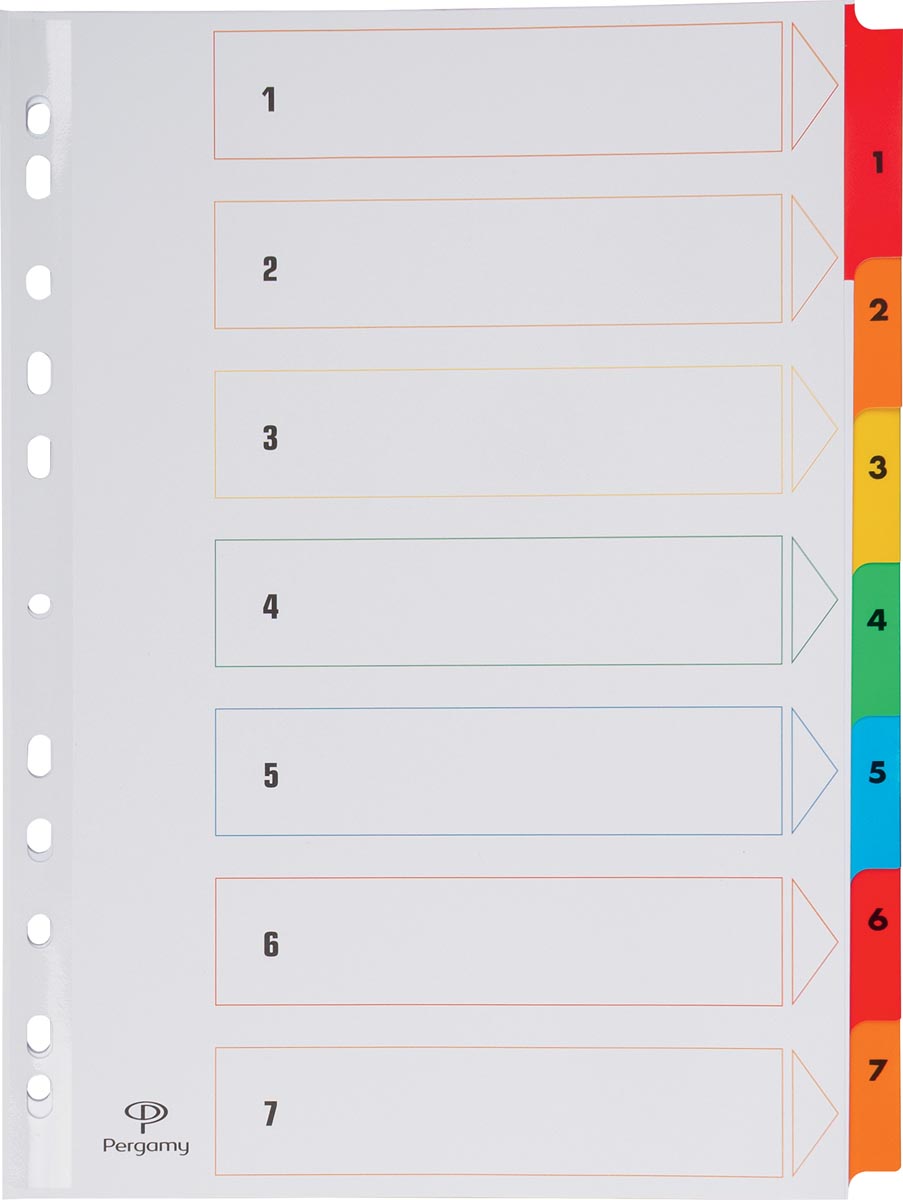 Pergamy tabbladen met indexblad, ft A4, 11-gaatsperforatie, geassorteerde kleuren, set 1-7 ( 10 pack). Ft A4. Uit wit karton van 170 grams . Met indexvel. Met versterkte gekleurde tabs. Bedrukking in het zwart. 11-gaatsperforatie. Recycleerbaar. Geleverd 10 pakjes totaal.