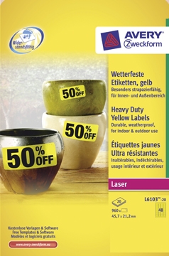Avery Etiketten Heavy Duty Ft 45,7 x 21,2 mm. Heavy Duty. Uit polyester. Rechthoekig. laser. Permanent hechtend. 960 Etiketten per doos. 48 etiketten per vel. 20 vel per doos. Op vel A4. Kleur: geel.