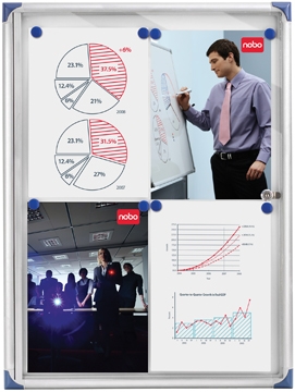Vitrine met veiligheidsglas (4 mm). Omlijsting van geanodiseerd aluminium. Openslaande deur (rechts of links, afhankelijk hoe de vitrine wordt opgehangen). Metalen achterwand voor gebruik met magneten en/of witbordstiften. Levering inclusief slot met 2 sleutels. Inclusief muurbevestigingsmateriaal. Geleverd per: 1 . Getoonde prijs is totaalprijs (exBTW). Pg. : 528